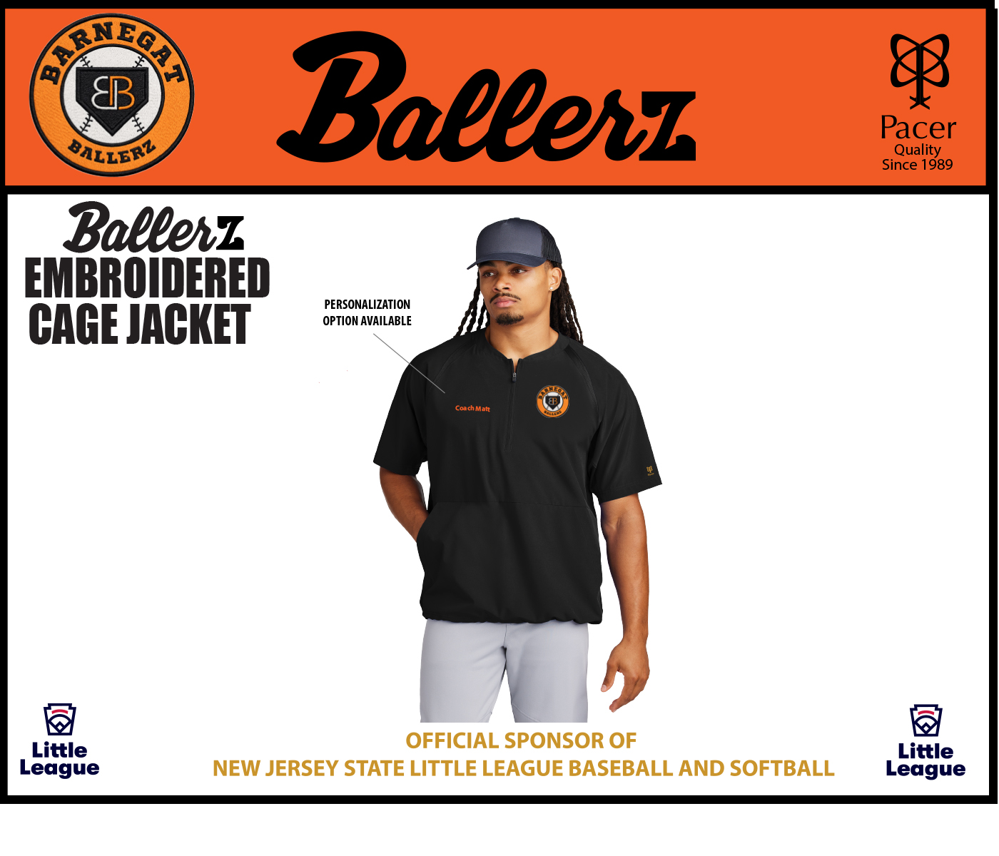 JPM LAWN & LANDSCAPEINTRODUCING THE BARNEGAT BALLERZ QTR ZIP SHORT SLEEVE PERFORMANCE CAGE JACKET by PACER. Show support for your favorite team by wearing this Ultra Lite Weight Performance Short Sleeve Qtr Zip Pullover Cage Jacket. Adorned with the Official Ballerz Logo Embroidered on the left front chest and featuring a 100% Dri-Power Performance Polyester with Quick-Dry & Anti Microbial Properties added for comfort. So whether your taking BP or walking around town, show support for your favorite Team by purchasing one today.