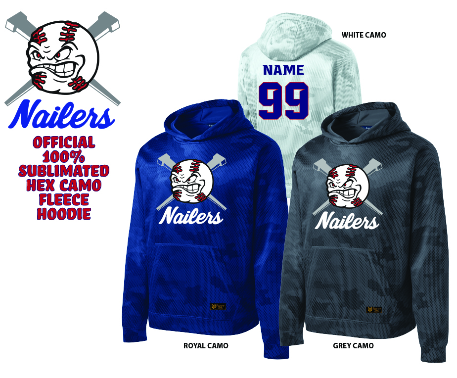 JPM LAWN & LANDSCAPEINTRODUCING THE OFFICIAL FREEHOLD NAILERS 100% SUBLIMATED HEX-CAMO HOODIE COLLECTION by PACER. Show support for your favorite team & player by wearing one or more of these 100% Sublimated Performance Pull-Over Fleece Hoodie's around town. Adorned with the Official Freehold Nailers Logo on the Front fully sublimated for a lifetime of washes.