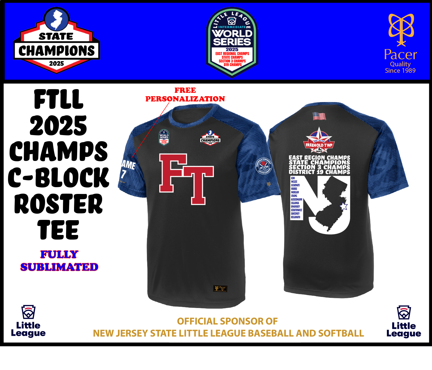 JPM LAWN & LANDSCAPEINTRODUCING THE OFFICIAL 2025 FREEHOLD TOWNSHIP LITTLE LEAGUE CHAMPIONSHIP C-BLOCK ROSTER TEE by PACER. Help Celebrate our very own 2025 EASTERN REGION - STATE CHAMPS - SECTION 3 & DISTRICT 19 CHAMPIONSHIP SEASON by wearing this 100% Performance Poly Tee around town. Adorned with the Official Little League World Series Logo on the Front Right Clavicle complete with the Four Major Championships Earned & the Championship Teams Roster Listed on the back. Add the Official FTLL Born On Logo, State Champs & Free Personalization on the Sleeves all fully Sublimated for a Lifetime of Washes without Cracking or Peeling.