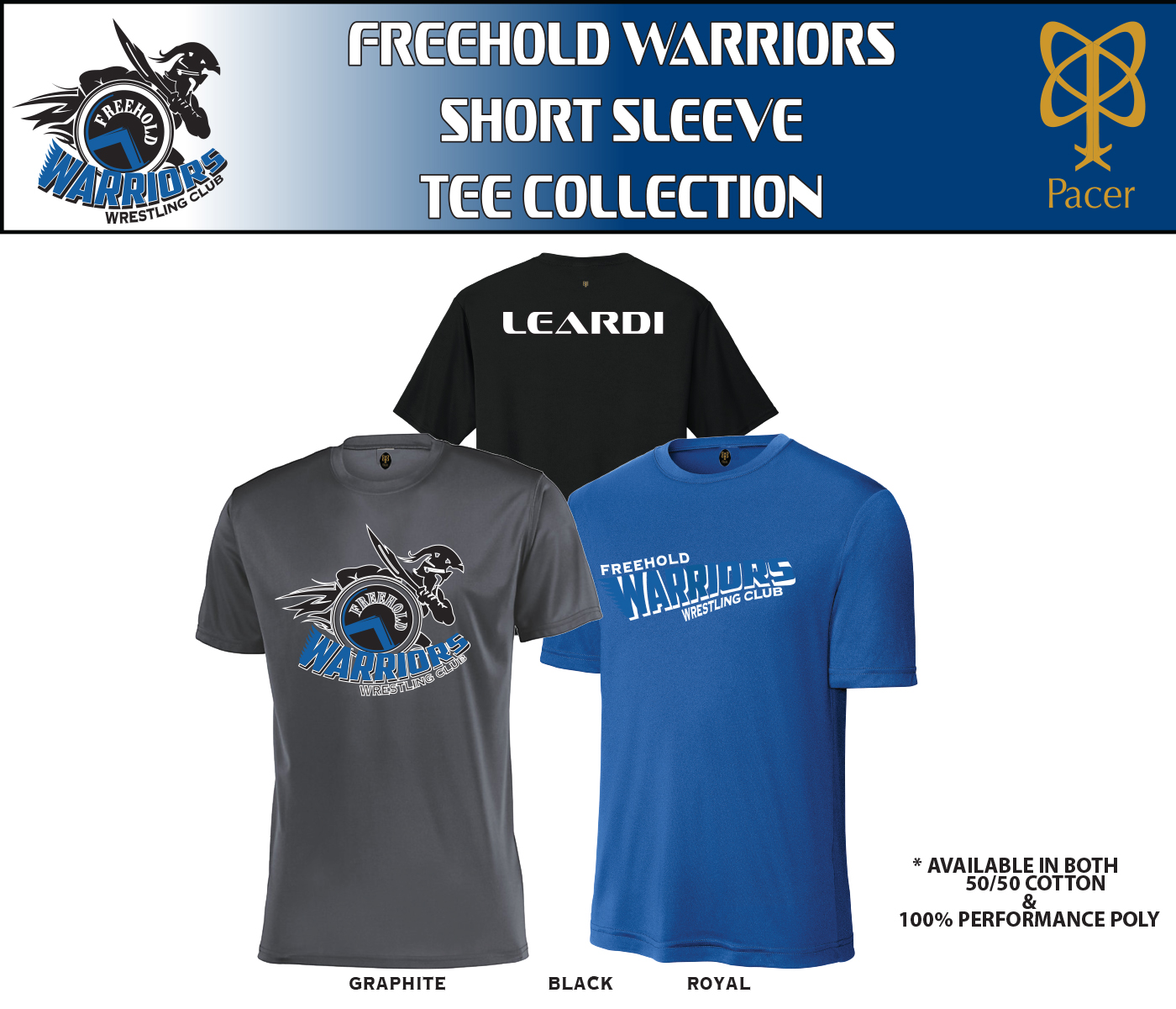 INTRODUCING THE OFFICIAL FREEHOLD WARRIORS SHORT SLEEVE PLAYERS TEE COLLECTION by PACER. Show Support for your favorite Organization by wearing one or more of these Short Sleeve Tees around town. Adorned with your choice of the Official Warriors Wrestling Mascot Logo or Wordmark Logo on the Front Chest in a High Density Silicone Application.