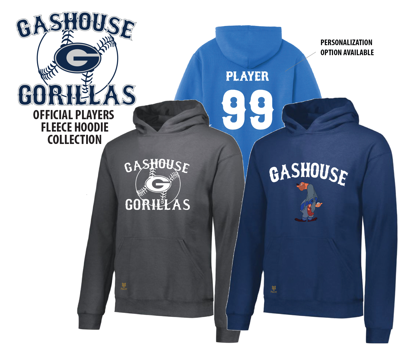 INTRODUCING THE GASHOUSE GORILLAS OFFICIAL PLAYERS FLEECE HOODIE COLLECTION by PACER. Show support for your favorite player & team by wearing this Unisex Pullover Fleece Hoodie Adorned with your choice of the Official GHG Wordmark Mascot Logo or Wordmark Baseball Logo on the Front in a High Density Silicone Application.