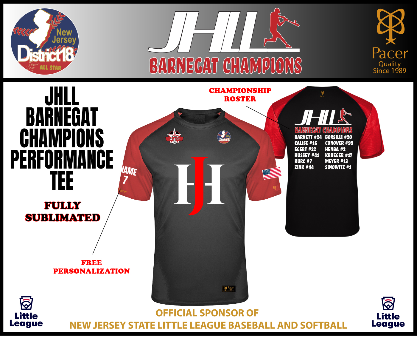 INTRODUCING THE OFFICIAL 2025 JACKSON/HOLBROOK LITTLE LEAGUE BARNEGAT CHAMPIONSHIP PERFORMANCE C-BLOCK ROSTER TEE by PACER. Help Celebrate our CHAMPIONSHIP SEASON by wearing this 100% Performance Poly Short Sleeve Tee around town. Adorned with the Official JHLL INAUGURAL SEASON Logo on the Front Right Clavicle, District 18 All Star Logo on the Left Clavicle, Interlocking JH on the Front Chest & the Championship Teams Roster Listed on the back all fully Sublimated for a Lifetime of Washes without Cracking or Peeling.