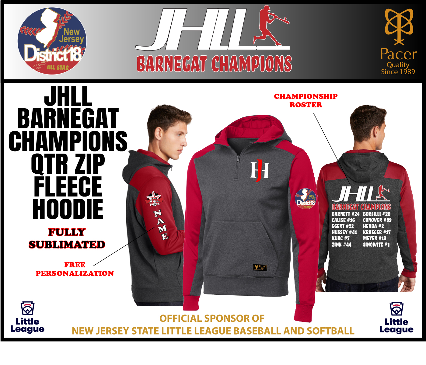 JPM LAWN & LANDSCAPEINTRODUCING THE OFFICIAL 2025 JACKSON/HOLBROOK LITTLE LEAGUE BARNEGAT CHAMPIONSHIP QTR ZIP ROSTER HOODIE by PACER. Help Celebrate this very special season by wearing this 100% Performance Poly Qtr Zip Fleece Hoodie around town. Adorned with the Official Interlocking JH Logo on the Left Chest, Official JHLL Inaugural Season Logo on the Right Shoulder, Official District 18 All Star Logo on the Left Shoulder & the Championship Teams Roster Listed on the back. All fully Sublimated for a Lifetime of Washes without Cracking or Peeling.