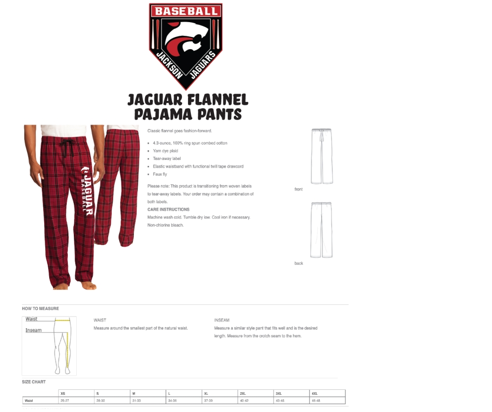 JPM LAWN & LANDSCAPEIntroducing the Jackson Jaguars Baseball Official Flannel Pajama Pants. Made exclusively for the Jackson High School Students, Alumni & Fans by PACER. Show your support for School & Team by wearing these 4.3oz Ring Spun Combed Cotton Yarn Dyed Plaid Pants which have an incredibly Soft and Relaxed unisex fit. Each comes with the Official Jackson Jaguar Primary Logo & Team Word-mark.