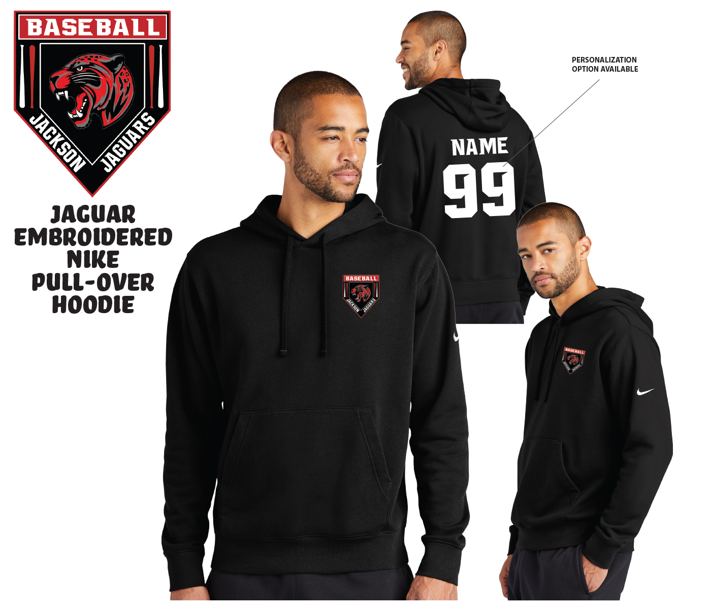 JPM LAWN & LANDSCAPEINTRODUCING THE JTHS NIKE EMBROIDERED PULL OVER HOODIE by PACER. Show your support for your favorite Team and Player by wearing this 8oz Poly-Cotton Pull Over Hoodie which has an incredibly Soft and Relaxed unisex fit. Adorned with the OFFICIAL JAGUAR BASEBALL CREST LOGO Embroidered on the Front Left Chest as well as the official Nike Swoosh Logo on the Left Sleeve.