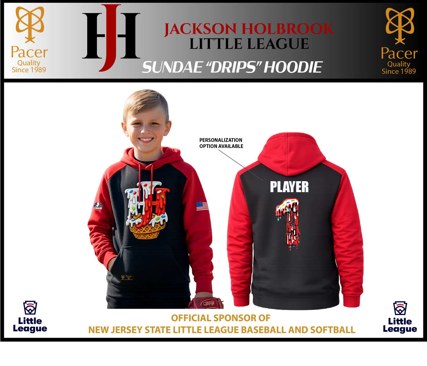 JPM LAWN & LANDSCAPEINTRODUCING JACKSON-HOLBROOK LITTLE LEAGUE 100% SUBLIMATED ICE CREAM SUNDAE DRIPS PERFORMANCE HOODIE by PACER.Show support for your favorite Player & Team by wearing this Unisex Pullover Fleece Hoodie Adorned with the NEW Interlocking JH Ice Cream Drip Logo on the Front Chest coupled with the American Flag on the Left Sleeve, D18 Logo on Right Sleeve, Little League Logo on Left Clavicle and Optional DRIPS Personalization on the rear