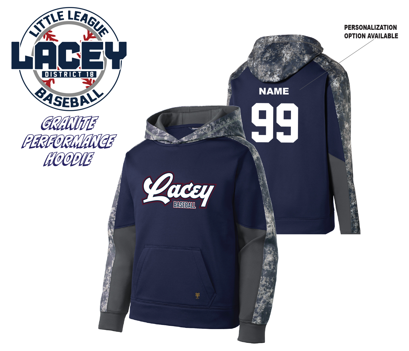 INTRODUCING THE LACEY LITTLE LEAGUE "GRANITE" PERFORMANCE FLEECE HOODIE by PACER. Show support for your favorite Player & League by wearing one of these Unisex Pullover Fleece Hoodies around town. Adorned with the Official Lacey Baseball Wordmark Logo on the Front Chest in a Full Color High Density Silicone Application & a Granite Mineral Sublimated Print across the Hood and Arms.