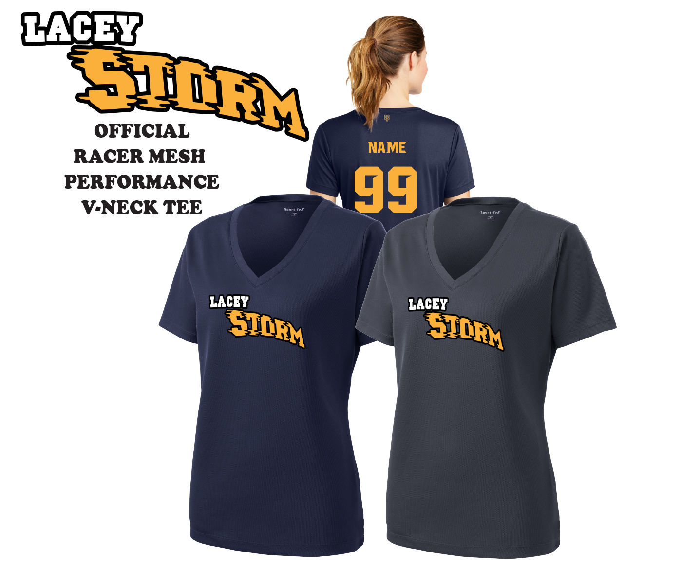 INTRODUCING THE LACEY STORM LADIES PERFORMANCE RACER MESH V-NECK TEE SHIRT COLLECTION by PACER.Show support for your Favorite Player & Team by wearing one or more of these Ladies Fit Performance Tee's Adorned with the Official Lacey Storm Wordmark Logo on the Front.