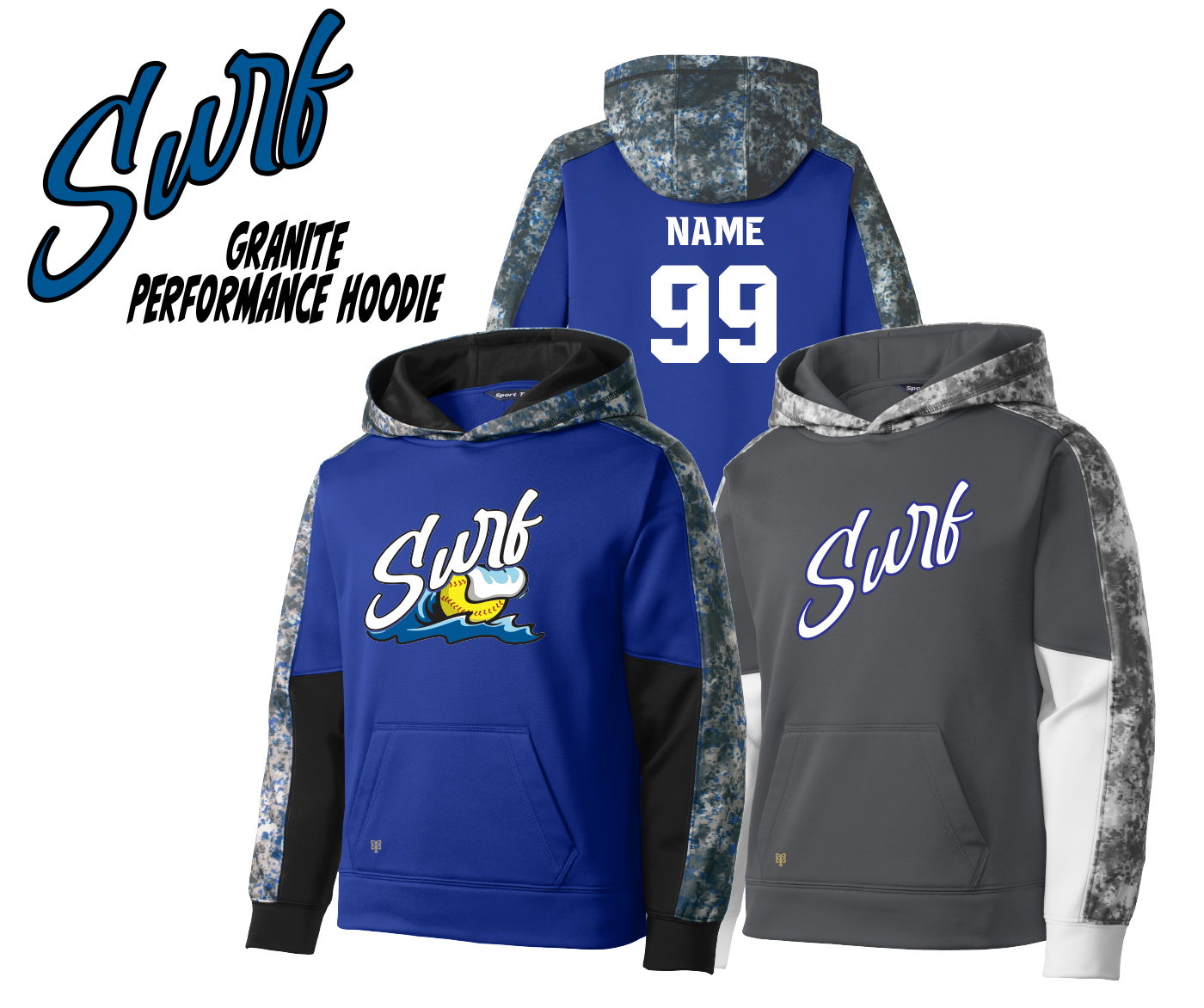 INTRODUCING THE TOMS RIVER SURF GRANITE PERFORMANCE FLEECE HOODIE by PACER.Show support for your favorite Player & Team by wearing this Unisex Pullover Fleece Hoodie Adorned with your option of the Official Surf Wordmark or Official Surf Wave Logo's on the Front Chest & a Granite Mineral Sublimated Print across the Hood and Arms.