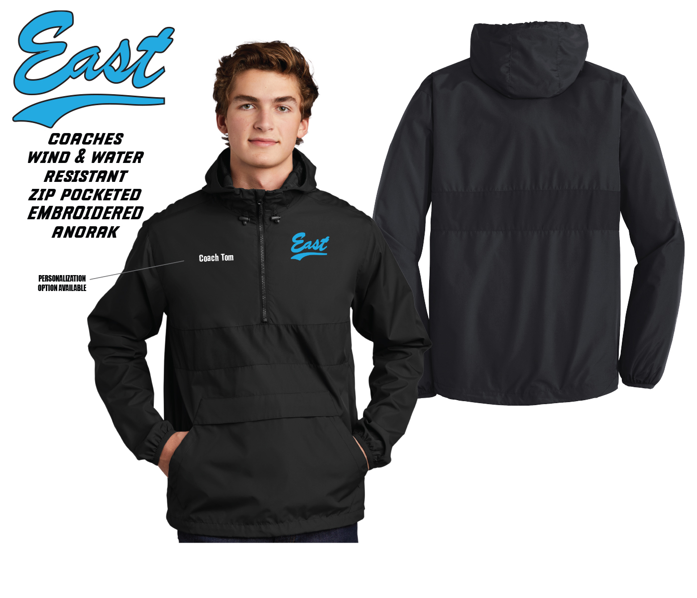 KEEP WARM & DRY IN THIS STYLISH QTR. ZIP PULLOVER HOODED ANORAK. THE PERFECT OUTER LAYER WHETHER ON THE FIELD OR IN THE DUGOUT.
